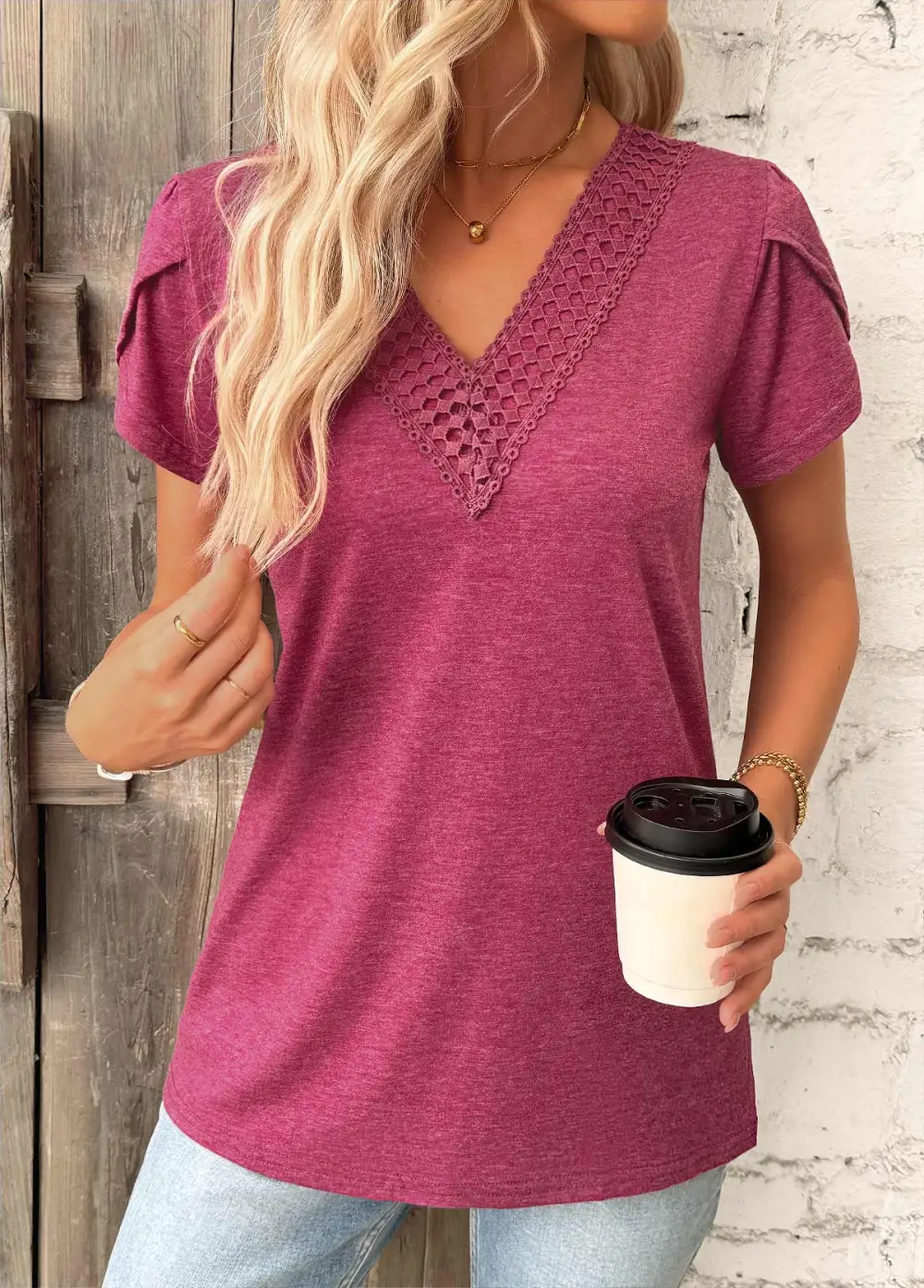 Dark Reddish Purple Short Sleeve V Neck T Shirt