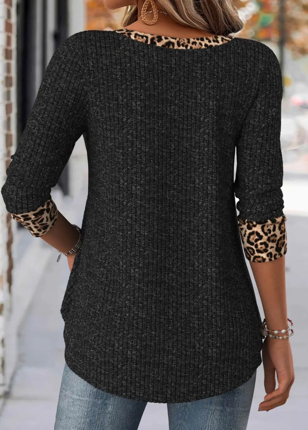 Black Leopard Long Sleeve Square Neck T Shirt