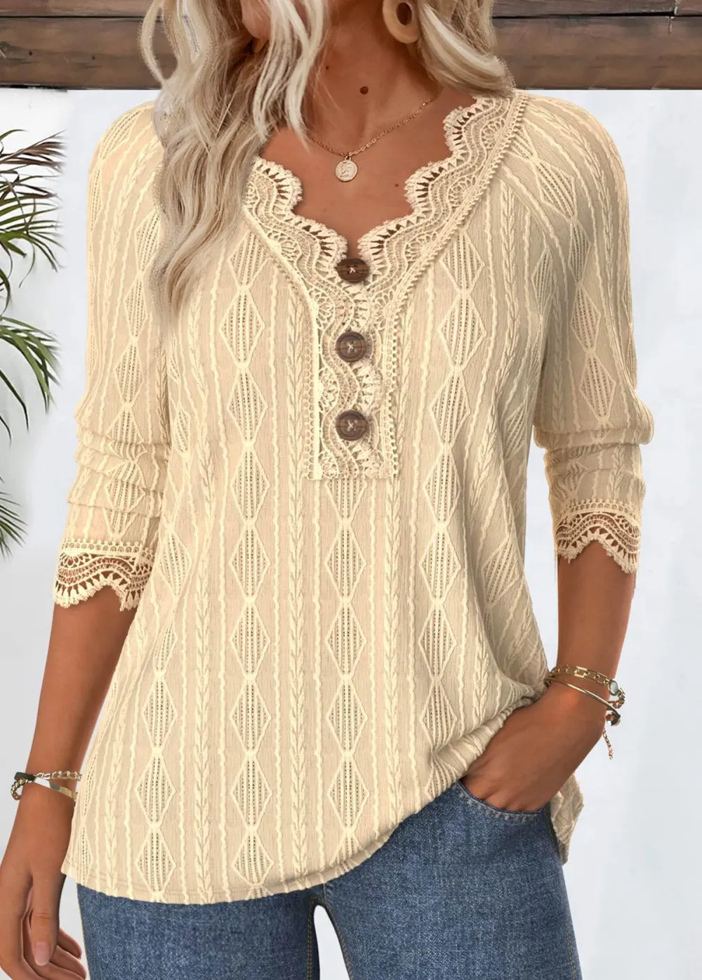 Beige 3/4 Sleeve V Neck T Shirt